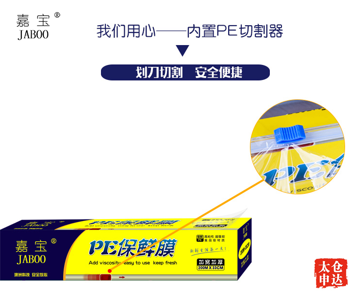 內(nèi)部含有不傷手的PE材質(zhì)切割器,粘貼在盒子上,方便切割,可自己調(diào)節(jié)所需保鮮膜長度