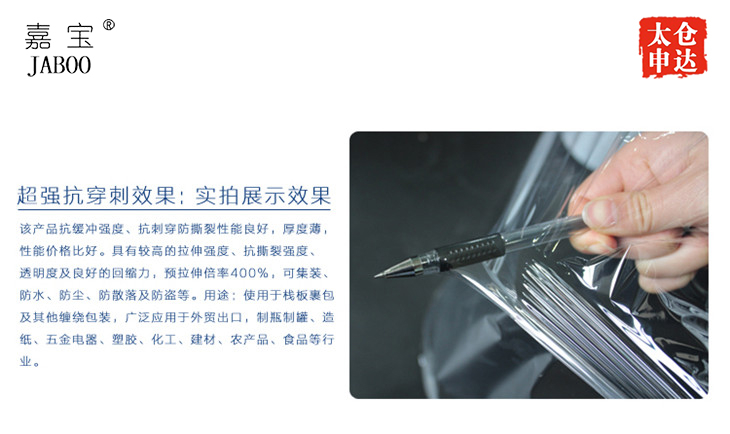 良好的防穿刺性能及橫向撕裂強度允許薄膜在高拉伸倍率下遇到貨物尖銳的角或邊不斷裂使包裝后的貨物更緊固